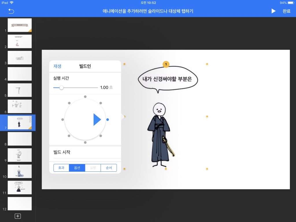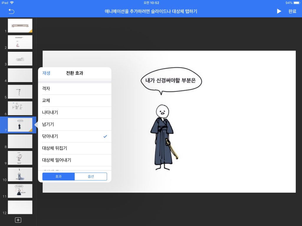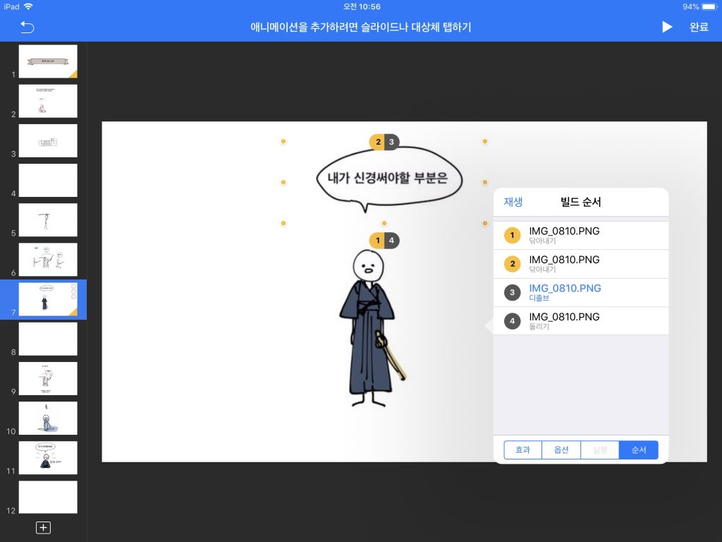 4. 애니메이션화하기 위해 슬라이드 전환효과와 지속시간, 전환 타이밍, 순서 등을 모두 지정한다.
