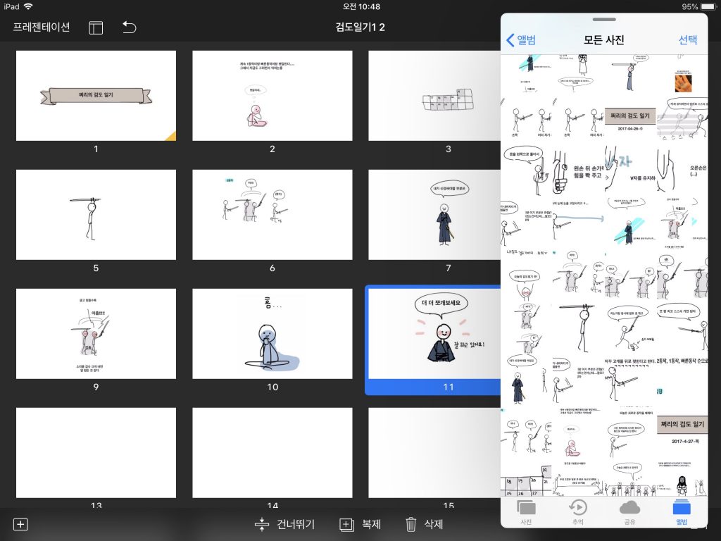 3. 이 과정에서 그림을 더 쪼개기도, 합치기도 한다. 애초 16:9 비율을 염두에 두고 그린 그림이 아니라서 그림과 말풍선을 분리해 다시 배열하는 경우가 잦다.
