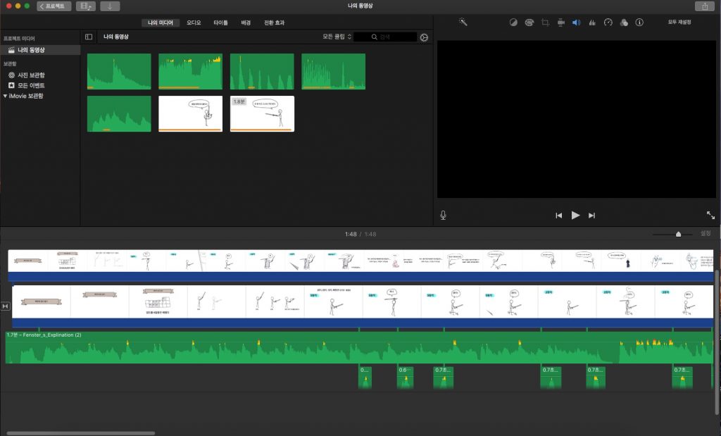 첨 만들 때 이 부분에서 시간이 엄청 걸렸다. 아주아주 지난한 디테일한 작업이다. 나는 검도를 잘 모르기 때문에 유튜브에서 검도동영상을 찾아봐가며 편집했다. 5. 음악선곡 4를 하면서 이 작업을 병행한다. 어떤 음악을 넣을 것인가에 따라 편집이 달라지기 때문이다. 리듬감이 중요. 저작권에 걸리지 않는 무료음원 중 근사한 걸 찾아야한다. 주로 유튜브 오디오 라이브러리에서 찾는데 어떨 땐 이 선곡작업에만 하루 이상이 소요된다...ㅜ 6. 최근엔 욕심이 생겨 아이무비를 이용, 사운드믹싱까지 하고 있다.